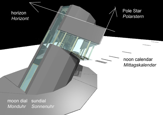 Pole Star The "house" is orientated exactly into the direction of the Pole Star (direction of the axis of the earth). Polarstern Das "Haus" richtet sich genau auf den Polarstern aus (Richtung der Erdachse). horizon The extending triangular part of the building points to the horizon, where sunset and sunrise take place at the solstices. Horizont Der vorstehende dreieckige Teil des Gebäudes zeigt am Horizont wo der Sonnenauf- und untergang zu den Sonnenwenden stattfindet. |