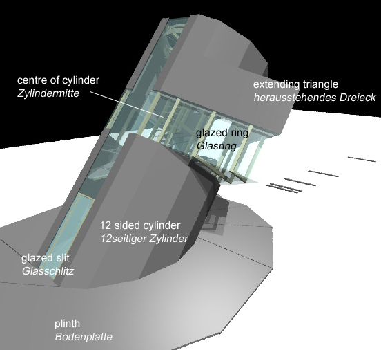 parts of the building The shape of the building is drawn from geometrical connections between sun and earth, that apply for Spurnpoint. Gebäudeteile Die Form des Gebäudes wurde aus den geometrischen Zusammenhängen von Sonne und Erde abgeleitet, die am Spurnpoint gegeben sind.