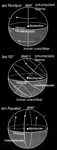 Nordpol bewegen sich die Sterne parallel, am Äquator senkrecht, dazwischen