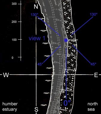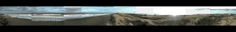 The map shows a bigger detail of the peninsula. I chose the site where the promontory points due south-north. The animation shows the area in which the sun rises and falls throughout the year. The panorama has been taken on the 21st of march 2002 during sunset. The blue numbers indicate the angle of the azimut from south direction. Die